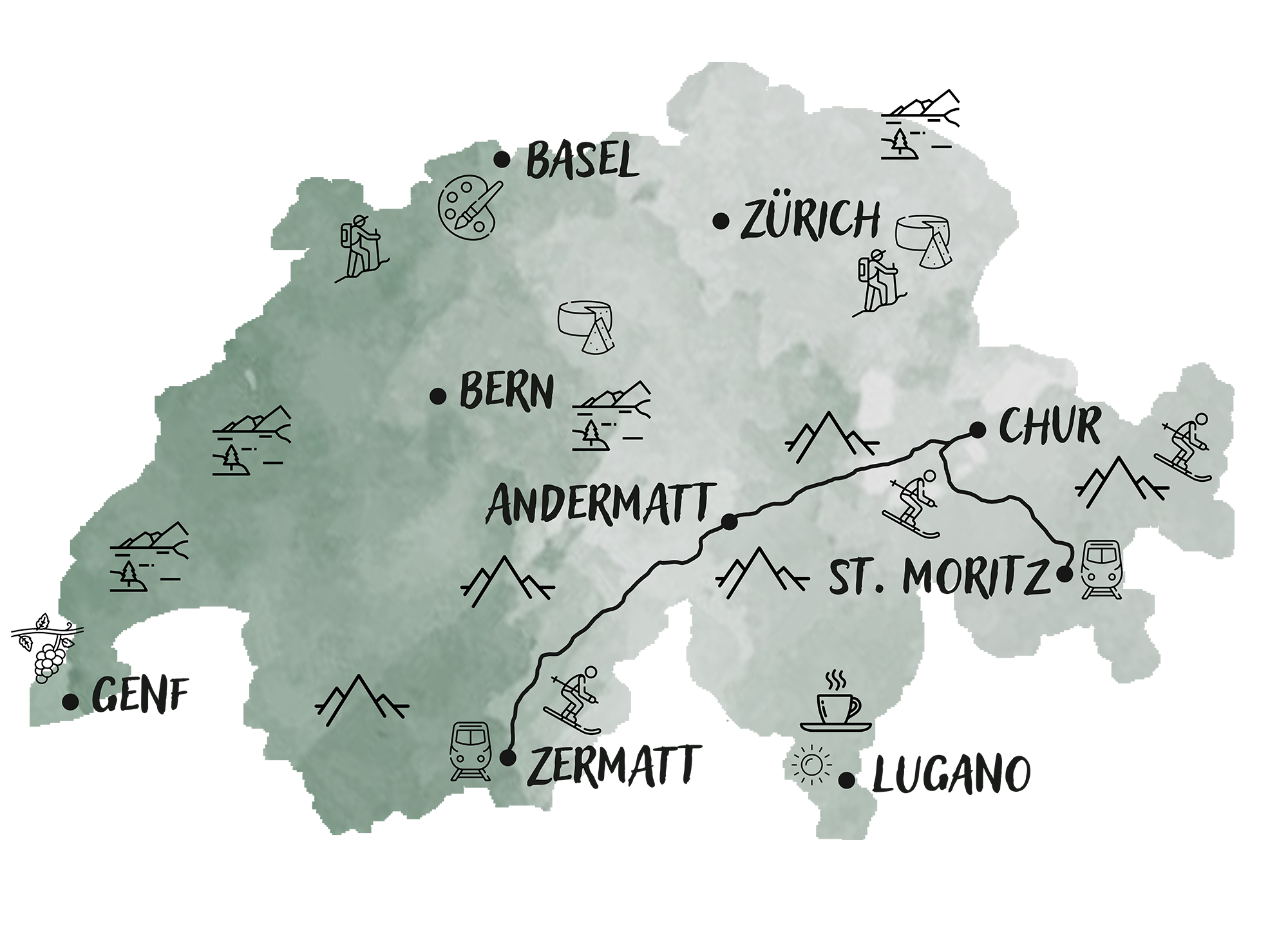 Zu den Highlights zählen ikonische Gipfel wie das Matterhorn, Panoramaorte wie Zermatt oder Wengen, spektakuläre Bahnfahrten über Pässe und durch Tunnels, Gletscherwelten im Wallis oder im Berner Oberland und türkisfarbene Seen wie der Oeschinensee.