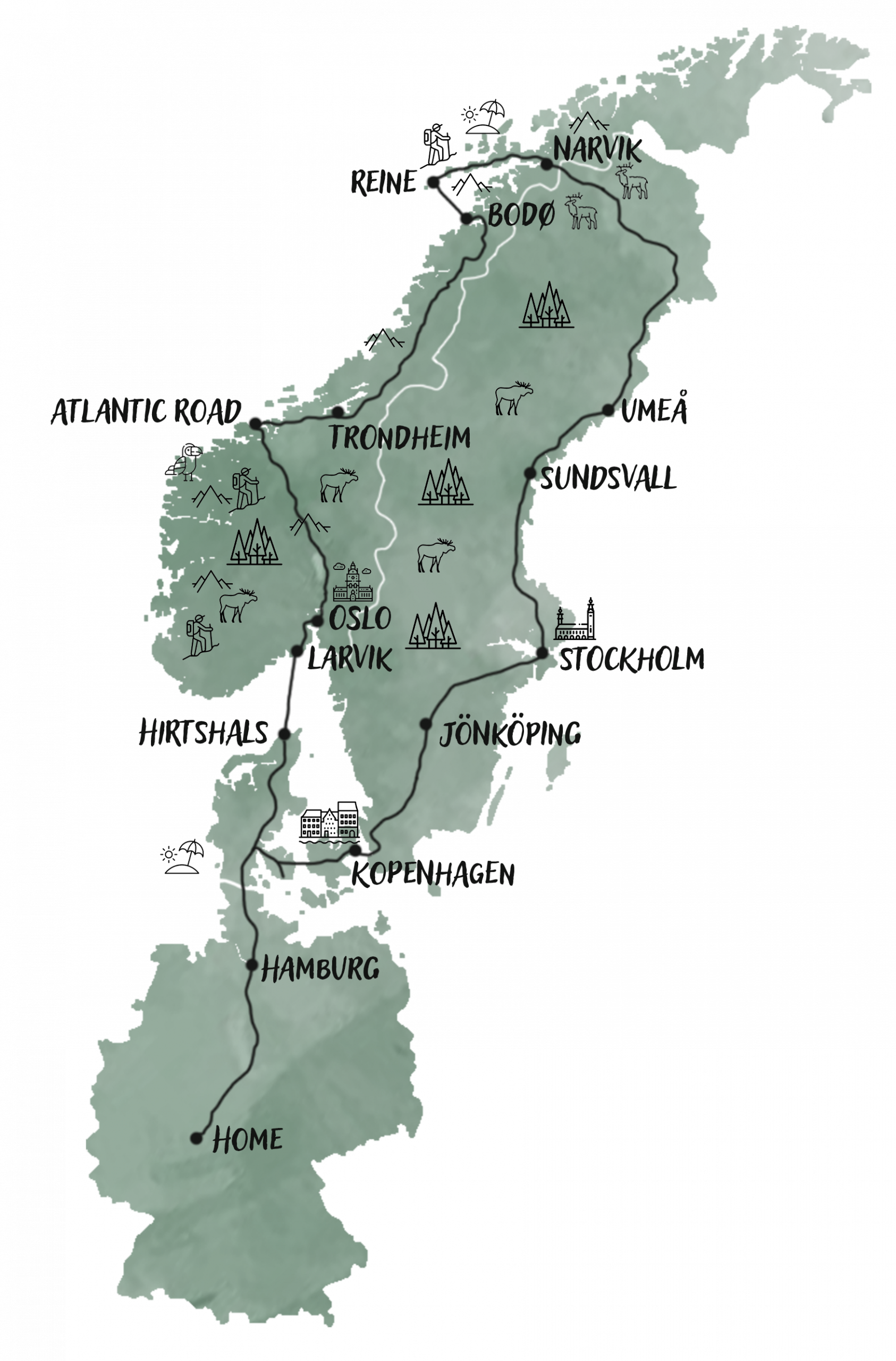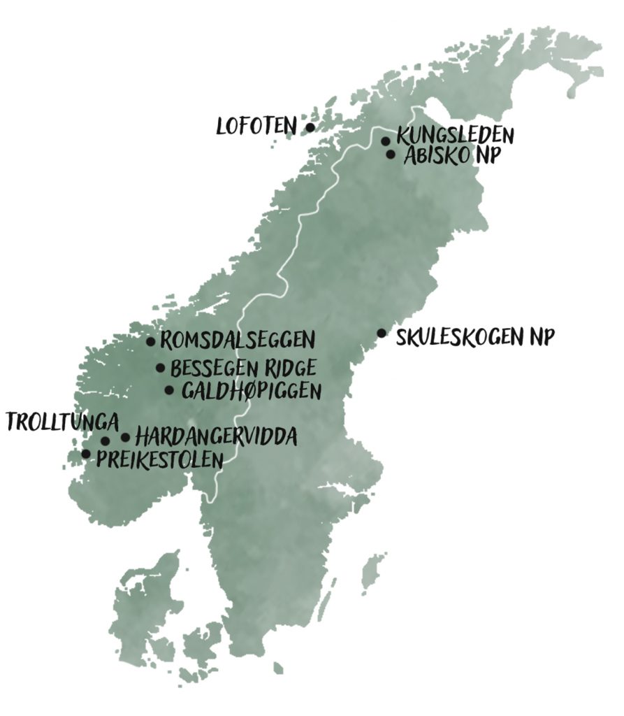 Skandinavische Naturvielfalt – von den flachen Wäldern Südschwedens bis zu den schroffen Küsten und Hochplateaus Norwegens.