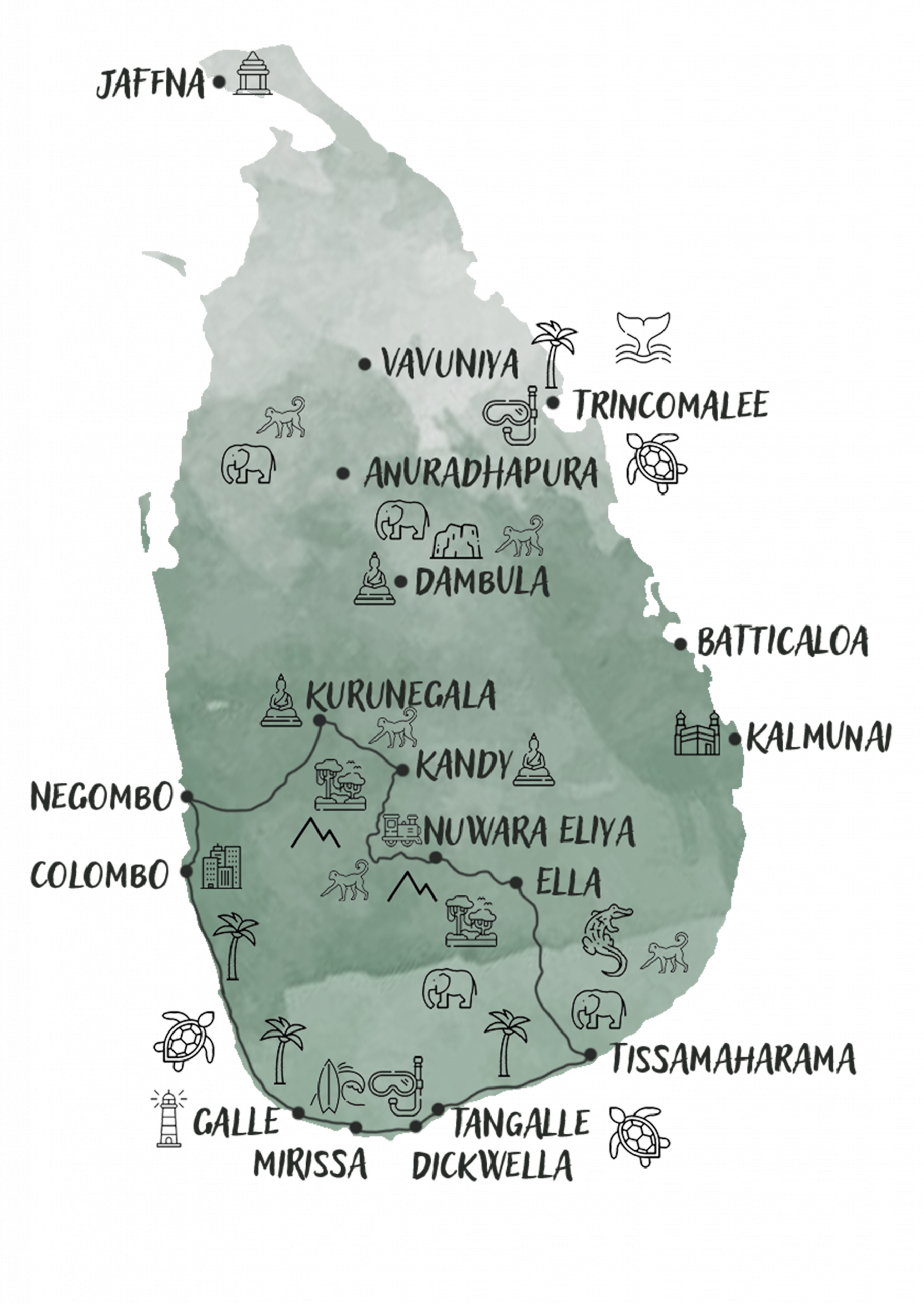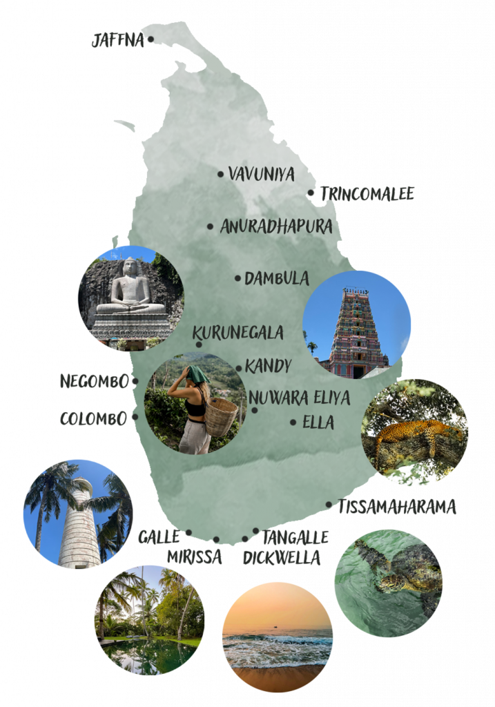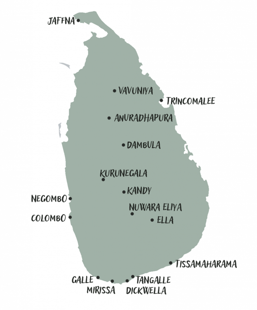 - West- und Südküste & Berge (z. B. Colombo, Galle, Kandy, Nuwara Eliya):