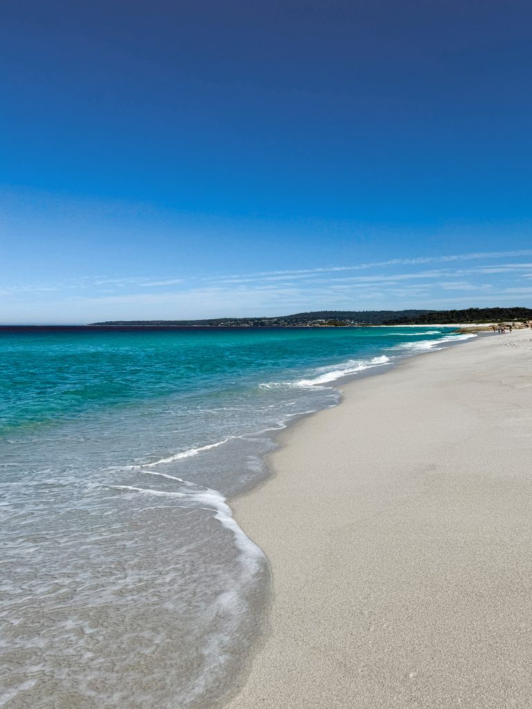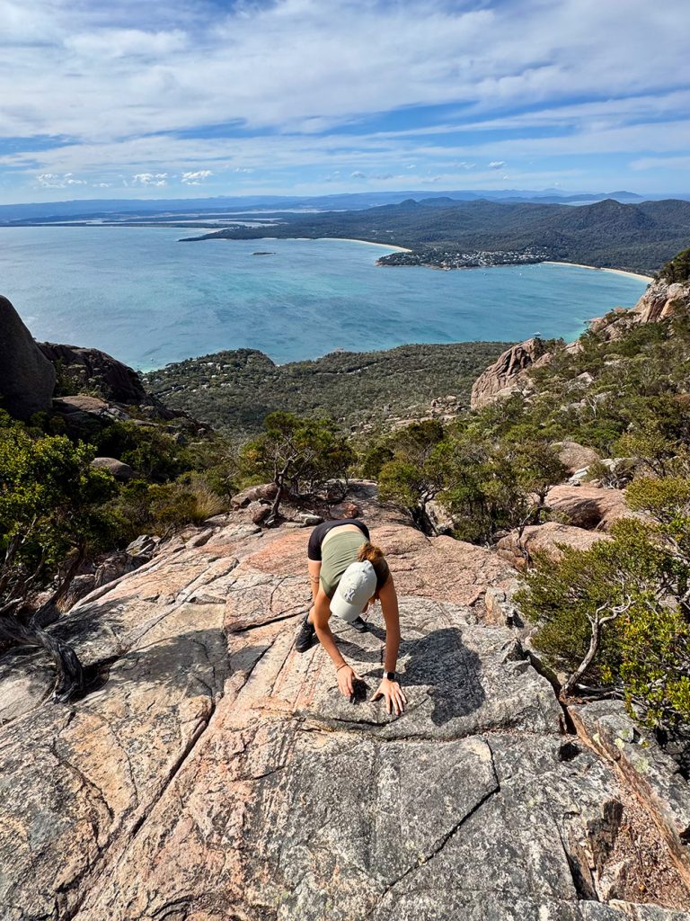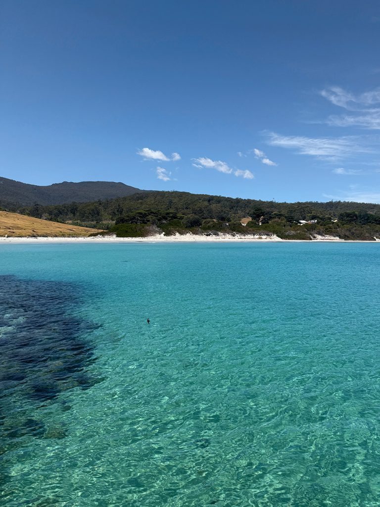 In Coles Bay machen wir einen längeren Halt. Der Strand sieht wunderschön aus, das Wasser glitzert, und wir haben Glück: Direkt in der ersten Reihe ist noch ein Stellplatz frei. Wir machen uns einen Kaffee, ziehen uns um und gehen ins Wasser. Es ist einer dieser Momente, in denen alles einfach passt.