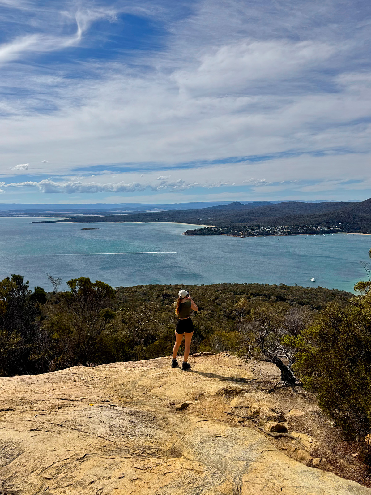 Oben angekommen haut uns der Blick komplett um. Die Weite, der Nationalpark unter uns, das Licht – ich kann kaum glauben, dass ich diese Aussicht gerade mit meinen eigenen Augen sehen darf. Oben gibt es erstmal Brote und ein paar Riegel. Wir sitzen da, schauen, schweigen, genießen. Dann machen wir uns langsam wieder auf den Weg nach unten.