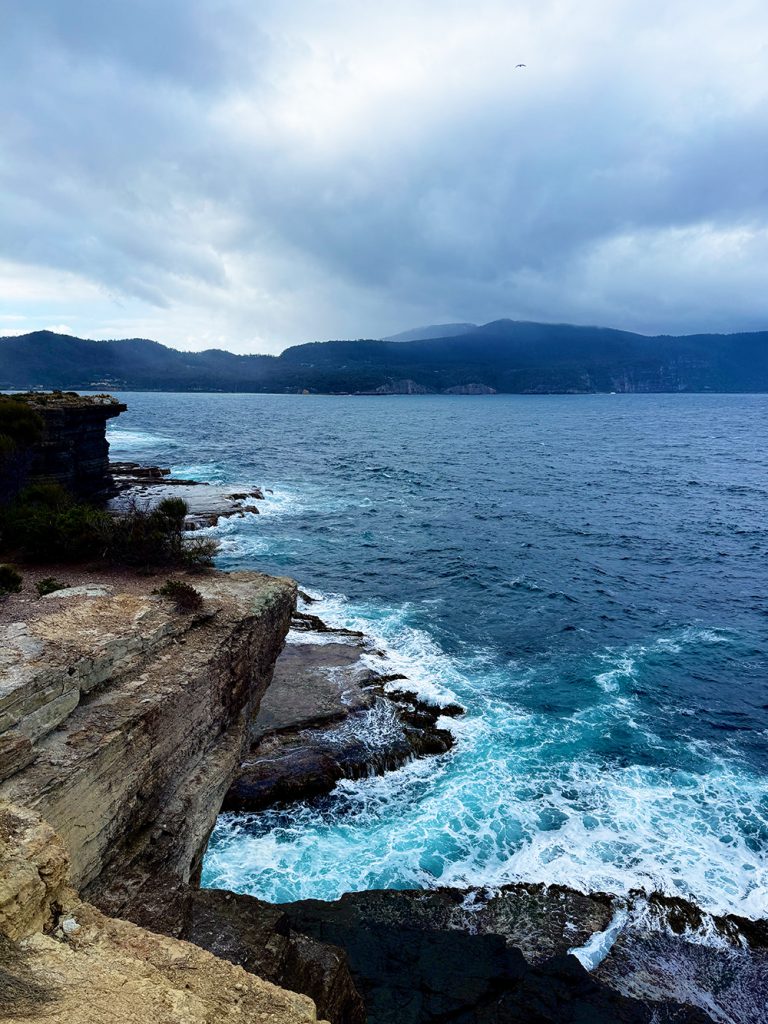 Gegen Abend fahren wir noch weiter Richtung Eaglehawk Neck. Wir schauen uns den Strand und den Ausblick an, fahren zum Blowhole und zu den Cliffs. Die Stimmung ist dramatisch: Das Meer schlägt wild gegen die Felsen, während sich im Hintergrund dicke, graue Wolken auftürmen.