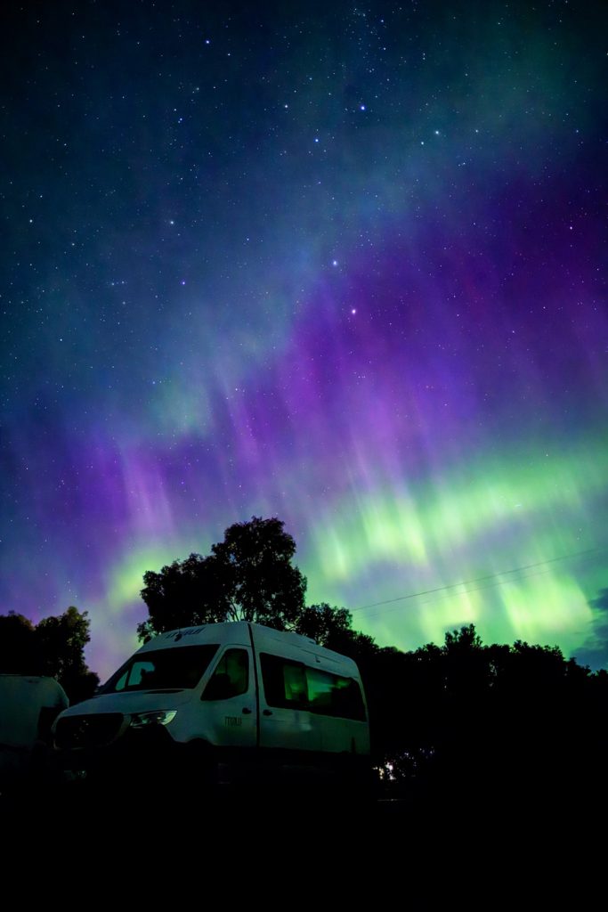Gestern Abend hieß es noch, dass Südlichter über Tasmanien zu sehen sein sollen. Wir standen in Sorell, nicht weit von Hobart, und ich hatte mir eigentlich keine großen Chancen ausgemalt. Wir gingen früh schlafen – und gegen 2 Uhr nachts werde ich plötzlich wach. Ich schaue aus dem Fenster und kann meinen Augen kaum trauen: da sind sie – die Aurora Lichter.
