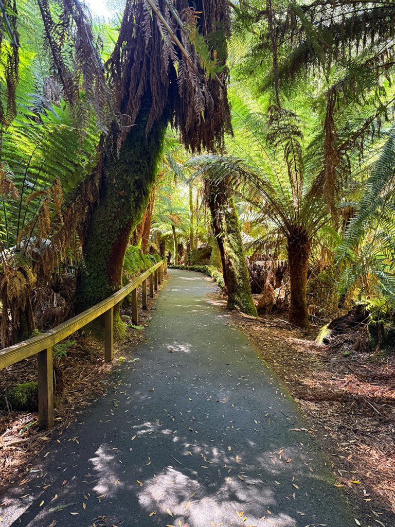 Im Park machen wir eine kurze Wanderung zu den Russell Falls. Der Weg ist gut ausgebaut, etwa 1,4 km hin und zurück, nahezu ohne Höhenmeter und in ungefähr 20–30 Minuten machbar. Der Wasserfall stürzt breit und kraftvoll über mehrere Stufen in die Tiefe, umgeben von Farnen und hohem Wald. Heute sind wir bewusst faul und verzichten auf eine größere Wanderung.