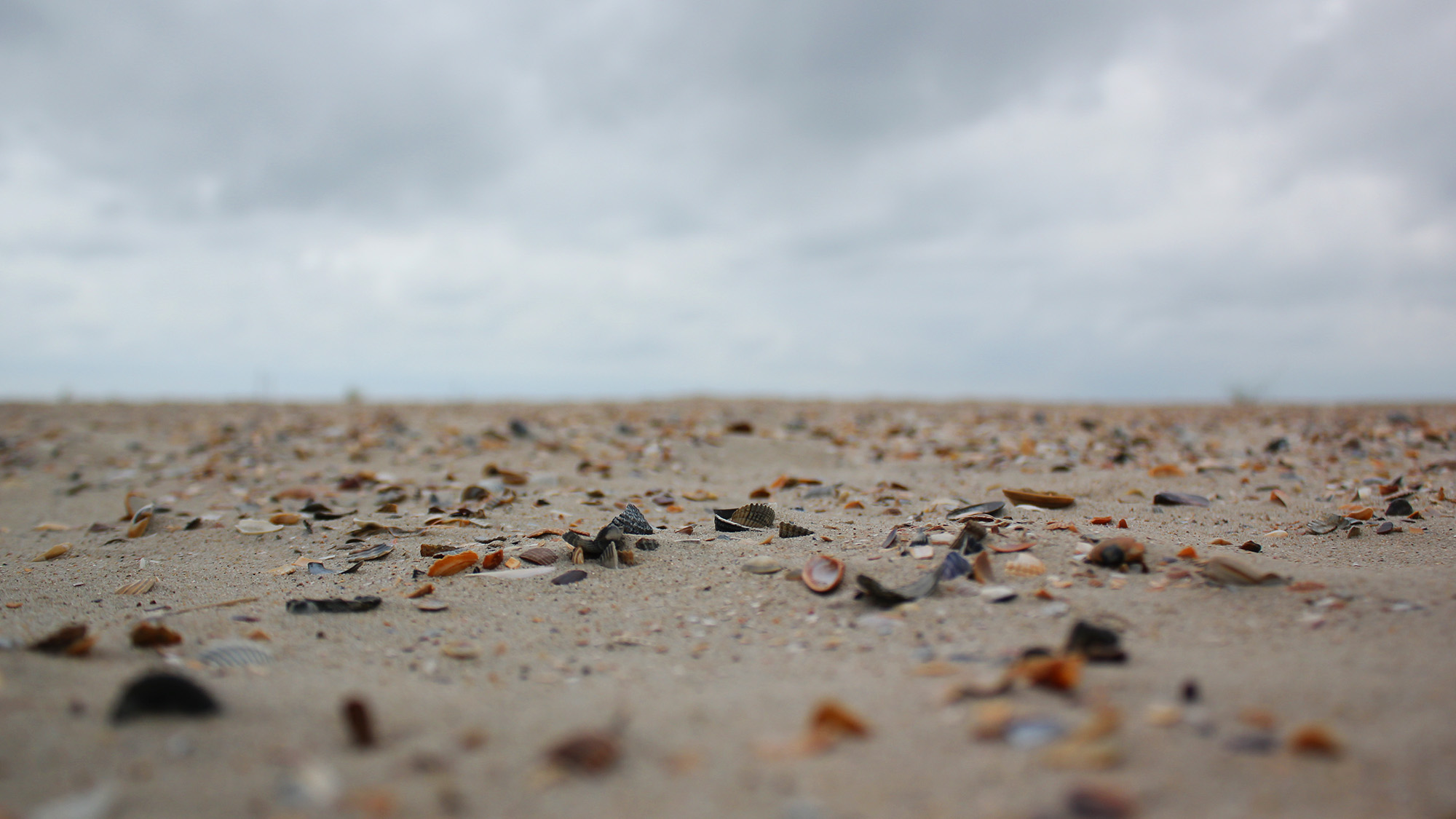 - Muscheln, Treibholz, Fußspuren als Vordergrund